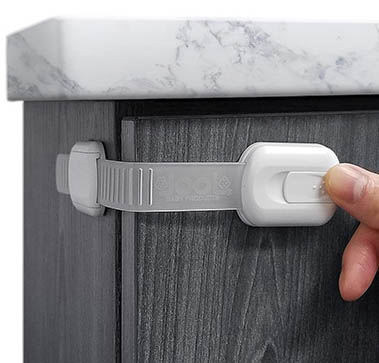 Our team also recommends these no-drill child safety straps. They can be used in a variety of places around the home.