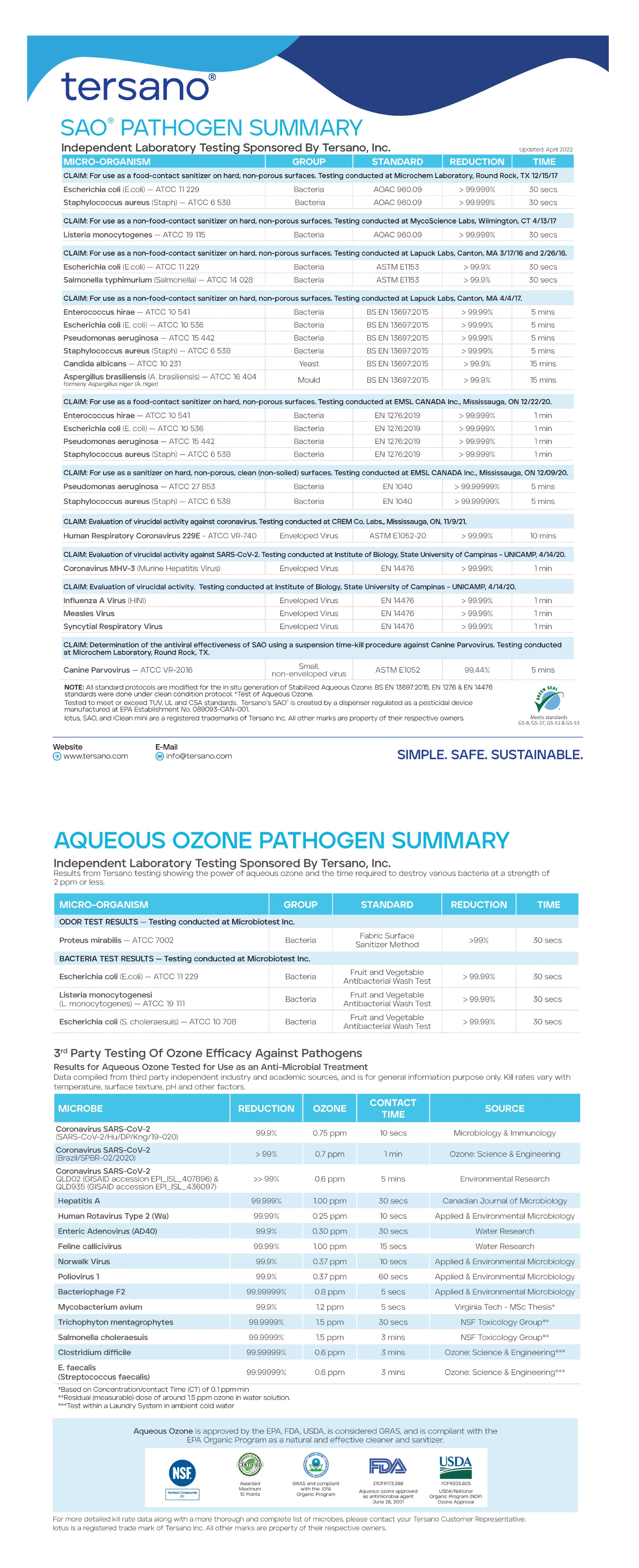 Please Note: Tersano’s SAO technology has been proven to kill many harmful pathogens between 99.9% and 99.99999% efficacy. Regardless of how well the ozone treatment works, use caution for immunocompromised people when handling the cleaning of things not proven 100% effective.
